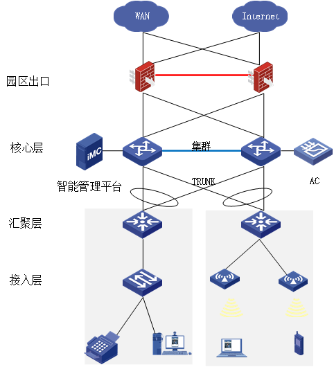 園區(qū)的骨干網(wǎng)和出口通常通過部署防火墻來實(shí)現(xiàn)進(jìn)入或者流出園區(qū)網(wǎng)絡(luò)數(shù)據(jù)的安全性。在出口,對病毒、垃圾郵件和網(wǎng)絡(luò)攻擊進(jìn)行過濾和防御。確保數(shù)據(jù)安全,避免信息被偷竊、修改和未授權(quán)的訪問??刂苾?nèi)部用戶訪問外網(wǎng)的行為。