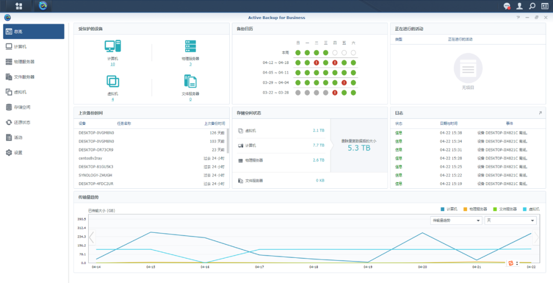 首先通過Active Backup for Business備份一體機(jī),將企業(yè)中的電腦、服務(wù)器和虛擬機(jī)數(shù)據(jù)統(tǒng)一備份到群暉服務(wù)器中,并且通過統(tǒng)一入口即可實(shí)現(xiàn)集中管理。