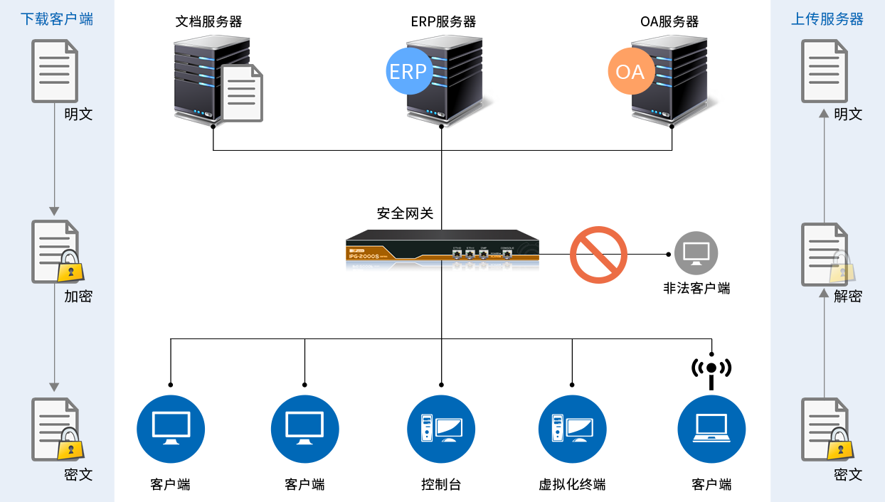安全網(wǎng)關(guān)結(jié)合IP-guard加密客戶端,對服務(wù)器重要數(shù)據(jù)進(jìn)行保護(hù)