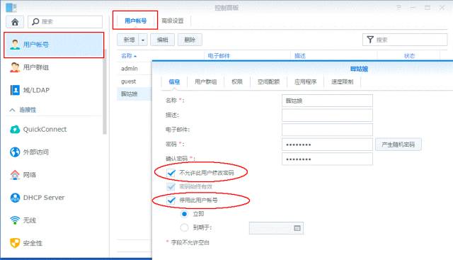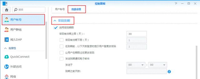 如果是一臺多用戶共用的NAS,除了用戶權(quán)限的設(shè)定,還可以如下圖設(shè)置用戶更改密碼的權(quán)限,還能設(shè)定此賬號的使用期限。