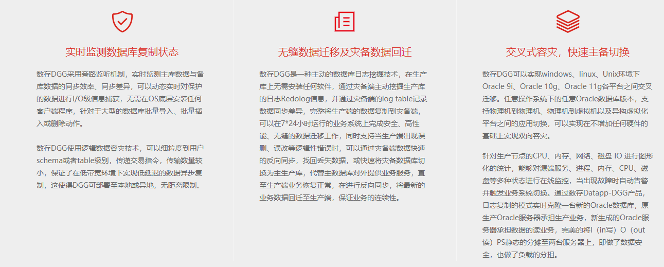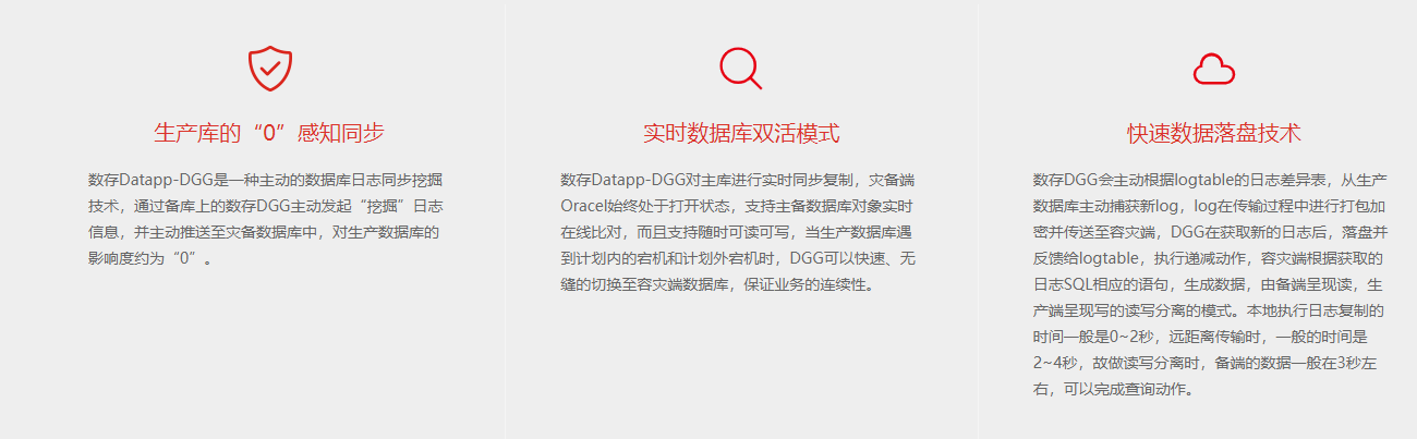 數(shù)存DGG產(chǎn)品是一款專(zhuān)門(mén)為數(shù)據(jù)庫(kù)提供實(shí)時(shí)容災(zāi)以及雙活高可用的產(chǎn)品解決方案。DGG基于Oralce日志挖掘技術(shù)對(duì)數(shù)據(jù)進(jìn)行實(shí)時(shí)復(fù)制,與主庫(kù)組成雙活的高可用模式,并具備讀寫(xiě)分離的性能優(yōu)化技術(shù),保證數(shù)據(jù)庫(kù)可以7*24小時(shí)正常運(yùn)轉(zhuǎn),滿足大型企業(yè)機(jī)構(gòu)對(duì)核心數(shù)據(jù)庫(kù)連續(xù)可用的要求。